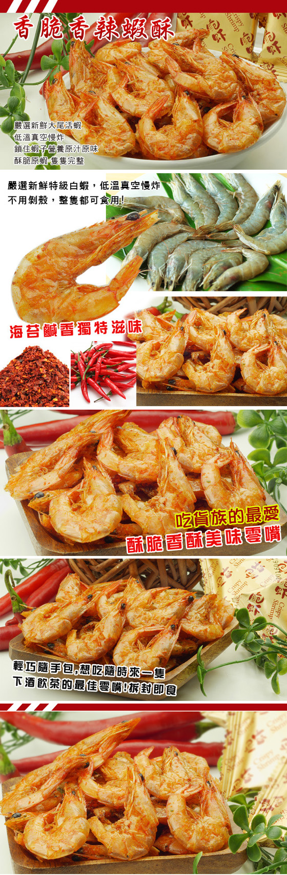 商品訊息簡述: 平均每包最低只要16元起(含運)即可享有香酥脆蝦迷你隨手包20包/40包/60包/120包/300包(6g/包,5包/袋),口味:原味/香辣/海苔/椒鹽?